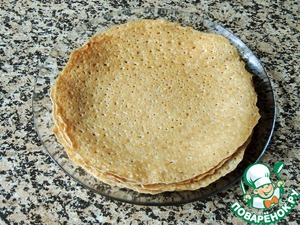 Приготовить блины по своему любимому рецепту (не слишком тонкие). Мой обычный рецепт: 700 мл молока, 2 яйца, 280 г муки, 1 ст. л. сахара, 1/2 ч. л. соли.