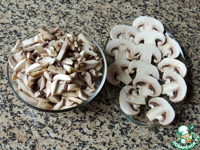 Грибы порезать соломкой. При этом не забыть из средней части нарезать целые пластинки для будущего украшения. Измельченные грибы потушить под крышкой до испарения жидкости.