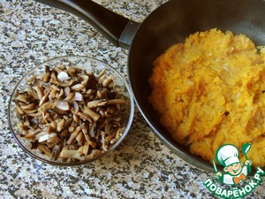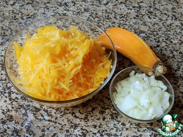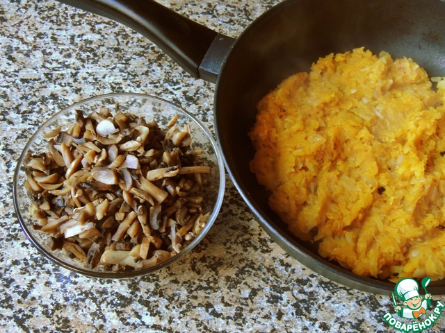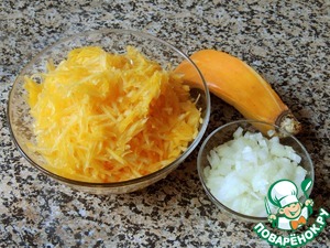 Мелко покрошить лук, обжарить его на растительном масле. Тыкву потереть на крупной терке, добавить к луку, жарить вместе до готовности тыквы.
