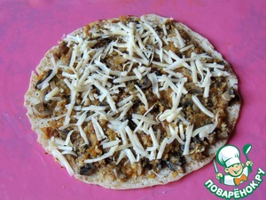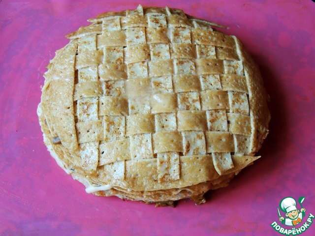 Блины укладывать стопочкой в форму или на противень (на силиконовый коврик), прослаивая каждый слой начинкой и присыпая крупно натертым сыром.