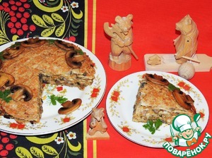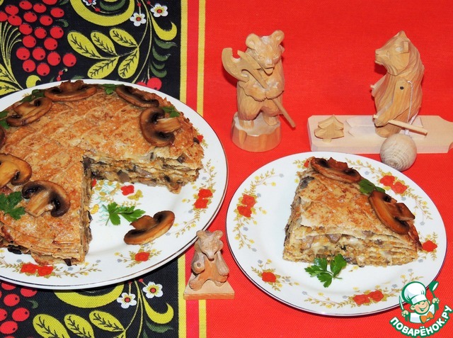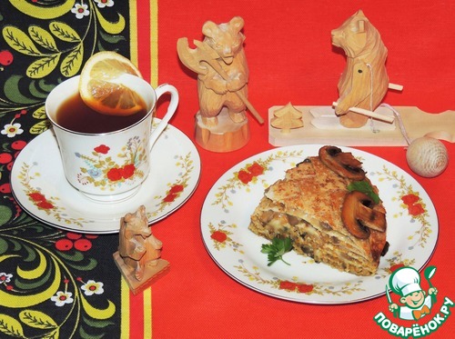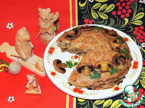 Блины по праву считаются традиционным русским блюдом. Предлагаю приготовить из них сытный и нарядный пирог с начинкой из тыквы, грибов и овсяных хлопьев. Очень вкусно и по-домашнему!