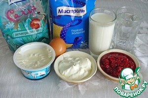 Подготовим необходимые продукты. (Забыла положить ванильный сахар). Для крема я использовала творожный сыр, можно взять хороший, не жидкий и не крупитчатый творог. Малина у меня протертая с сахаром из заморозки, можно использовать любую ягоду на свой вкус.