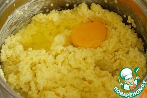Готовой каше дать немного остыть, добавить яйцо и перемешать. У меня яйцо крупное, если мелкие, то можно добавить два.