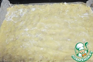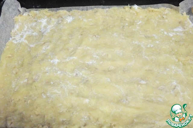 Тесто делим на две неравные части. Большую часть выкладываем на противень и распределяем по дну, я это делала руками. -