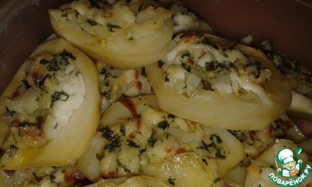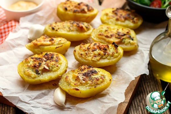 Обильно намазываем на каждую половинку нашей картошки наше чесночное масло и ставим в разогретую до 200 гр. духовку на 10 минут.