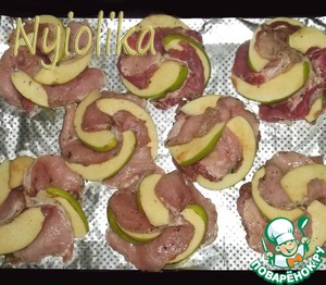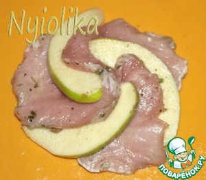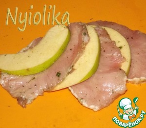 Нафаршировать каждый кусочек свинины из 3-4 недорезанных до конца ломтиков дольками айвы.