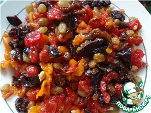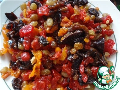 - Сухофрукты (курага,изюм,чернослив 2-3 горсти,заранее замочить) — 3 горст.
