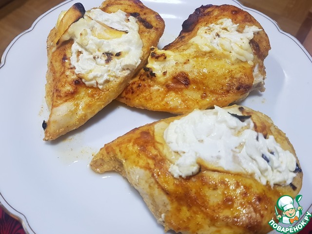 В кармашек куриной грудки вложить подготовленную начинку. Положить на грудку 3 ст. ложки густых сливок и завернуть в фольгу.