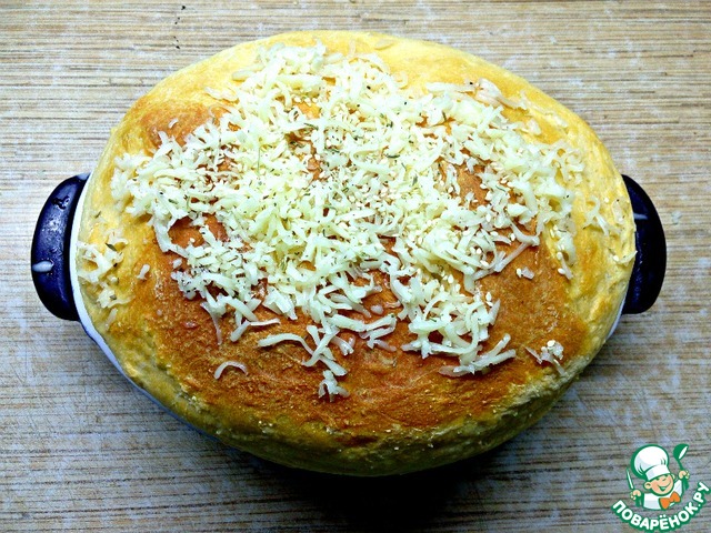 Когда хлеб готов, посыпать верх тертым сыром, кунжутом и прованскими травами и вернуть в духовку еще на 5 минуток, чтобы сыр расплавился. -