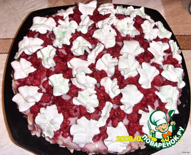 • Сделала дополнительно ещё крем. Но немного изменила. Сливки взбила, так как у меня малина, добавила сгущёнку со вкусом малины и желатин.