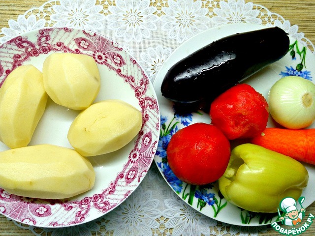Для начала сварим бульон. Я не писала мясо в ингредиентах для бульона, так как у каждого свой любимый. Пока варится бульон подготовим овощи. Картофель, лук и морковь очищаем и моем. Помидоры моем и снимаем кожицу, болгарский перец моем и вырезаем семена и перегородки, баклажан моем и удаляем хвостик. Кто не любит кожицу в баклажане, тоже можно срезать.