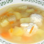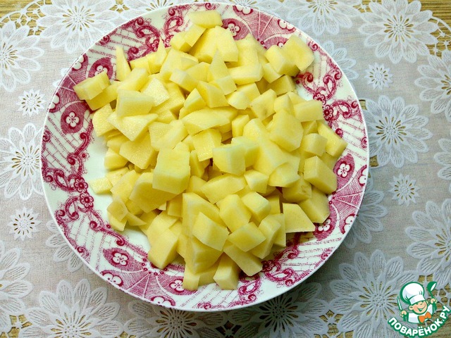 Когда бульон готов нарезаем картофель небольшими кубиками и кидаем в бульон.