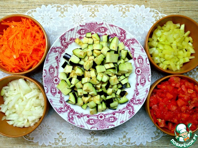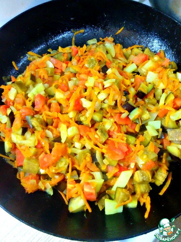 На растительном масле сначала ожариваем лук, пару минут до готовности, затем к луку добавляем морковь, болгарский перец, баклажан и помидор. Немного тушим овощи вместе 3-5 минут.