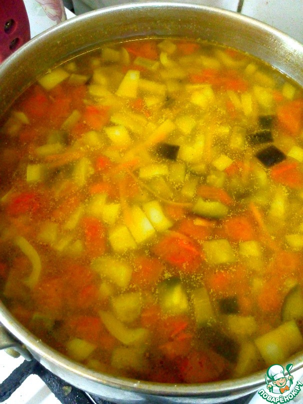 Затем закладываем тушенные овощи в бульон к картофелю. Солим, перчим по вкусу. Варим минут 5. Затем засыпаем манку и варим еще 3 минутки.