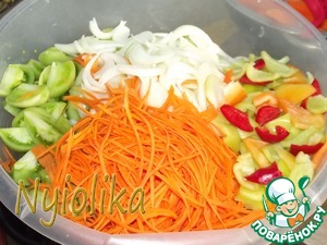 Промыть и нарезать овощи. Помидоры на 6-8 частей, морковь соломкой, лук-перьями, перец треугольничками.