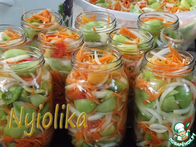 Залить банки маринадом и стерилизовать. Литровые банки в микроволновке (4 шт) 10 минут при полной мощности, еще 15-20 при 80%. Овощи не должны развариться. После закатки банки укутываются и еще немного "доходят".