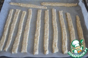 • 5. Переложить полоски на противень, накрытый промасленным пергаментом. Поставить в духовку на 220С на 12 минут.