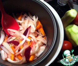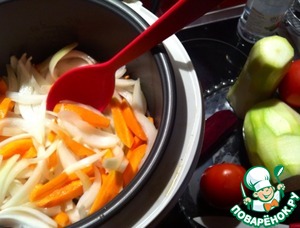 Порезать лук, морковь. Мельчить не надо. Поместить в мультю, в разогретое масло.