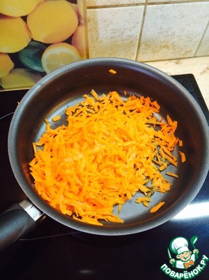 Морковь обжариваем в небольшом количестве растительного масла, буквально 3-4 минуты на среднем огне. -