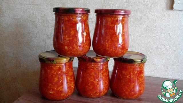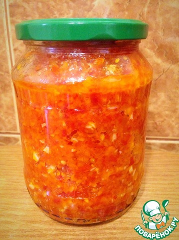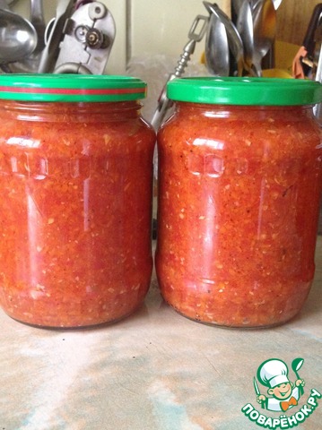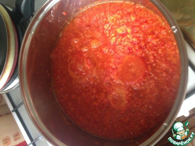 Смешиваем морковь, помидоры, сахар, соль и подсолнечное масло и ставим варить. Через 20 минут кладем в кастрюлю чеснок. Еще через 10 минут добавляем уксус и молотый перец.