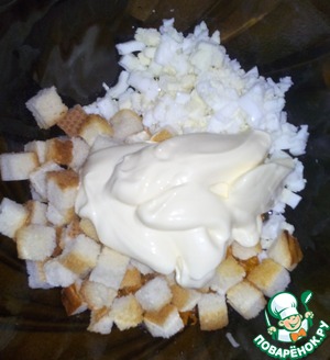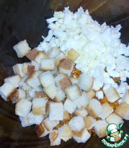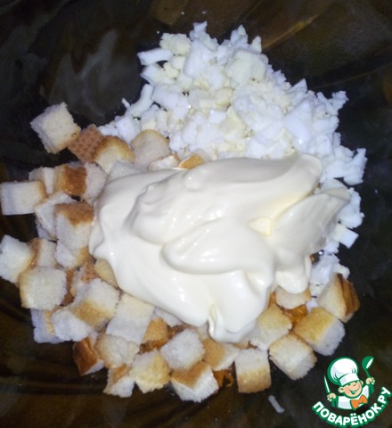 Сухарики я делала сама. Батон порезала на кубики и посушила в духовке. Но можно взять и готовые с каким-нибудь вкусом.