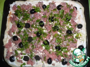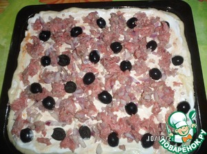 Сверху положите мясо, репчатый лук. У меня красный, но подойдет любой. И маслинки половинками.