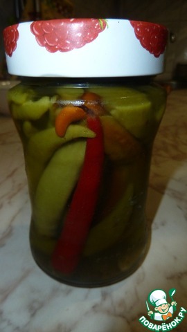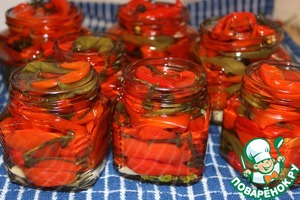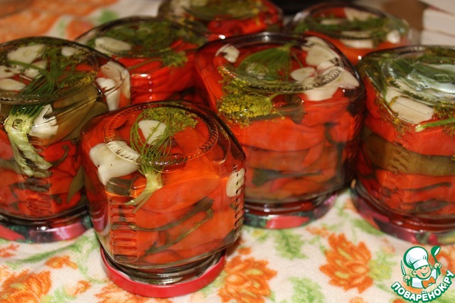 Следом укладываем в наши баночки перчик. И заливаем маринадом до самого горлышка.