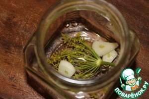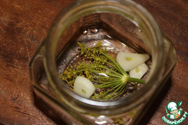 В стерильные баночки кладём по зонтику укропа, несколько долек чесночка.