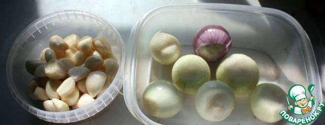 Чистим лук и чеснок (здесь его больше, ибо я еще и кабачковую икру закатывал, но это другая история). Чеснок чистить муторно, а лук грустно. Аж до слёз...
