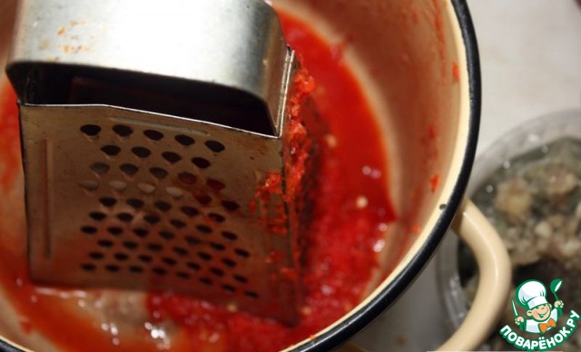 Кладем их в измельчитель ручной портативный (дуршлаг на кастрюле) и вот такой хреновиной прессуем, пока нужная масса не окажется внизу.