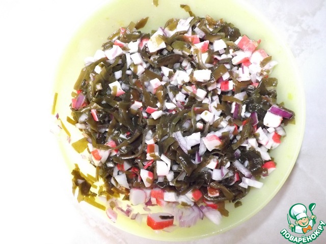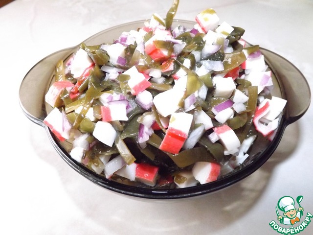 Вкусный, быстрый и очень легкий в приготовлении салат. Для любителей морской капусты. Это мой первый рецепт на поваренке, так что не судите строго.