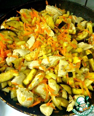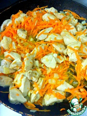 На растительном масле обжарить кусочки филе, добавить лук и морковь.