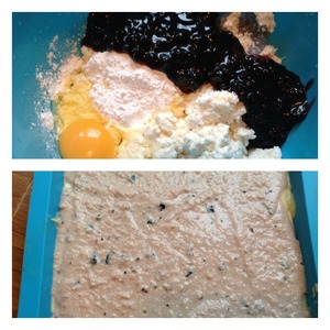 В чашке взбить яйцо, творог, пудинг ( или 2 ст л крахмала и 1 гр ванилина), и варенье. У меня с ягодками из черной смородины. Варенье лучше брать с кислинкой.