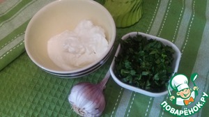 • Пока кабачки "стекают", подготовим соус - мягкий нежирный творог (или сметану, или натуральный йогурт) смешаем с нарезанной петрушкой (или любой зеленью) и чесноком. Посолить, поперчить по вкусу. Убрать в холодильник.