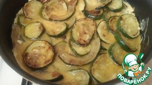 • В сковороде разогреть немного растительного масла и обжарить кабачки с двух сторон на довольно большом огне под крышкой. Выкладывать на тарелку, пересыпать 1 зубчиком мелко нарезанным чесночка (больше для запаха, чем острого вкуса).