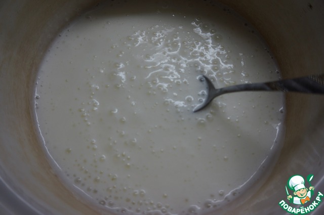 • В большую миску наливаем теплый кефир и додаем соду до утворения пузырьков и пены. Масса увеличится в 2 раза