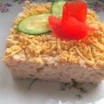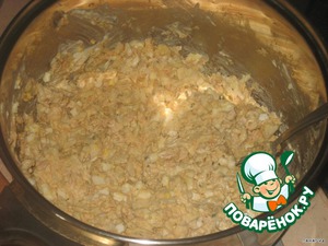 Смешать отварной рис,мелко порезанные яйца,лосоь(предварительно вынуть косточки и размять вилкой).