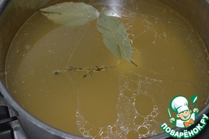 • Поставьте бульон на огонь, положите в него луковицу, лавровый лист, веточку тимьяна и душистый перец.