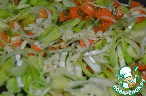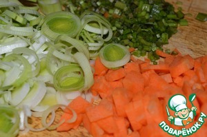 • Морковь и сельдерей нарежьте небольшими брусочками, порей кружочками, чеснок измельчите.
