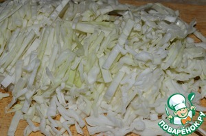 • Капусту нашинковать не очень тонко и положить к остальным овощам тушиться. Тушить до мягкости.
