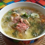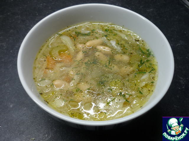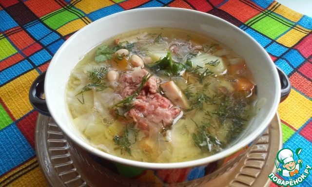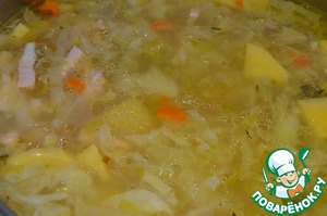 • Добавить в суп фасоль, грудинку (рульку) и/или утиную тушенку, посолить и поперчить по вкусу. Довести суп до кипения и томить еще 15 минут.