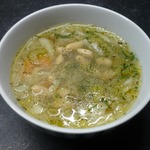 Добавить в суп фасоль, грудинку (рульку) и/или утиную тушенку, посолить и поперчить по вкусу. Довести суп до кипения и томить еще 15 минут.