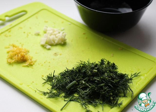 Чеснок и зелень мелко нарезать. Натереть на мелкой терке цедру половины лимона. Выжать сок лимона так, чтобы получилось 1-2 ст. л. (по вкусу, я люблю цитрусовую нотку, поэтому добавляю 2-3 ст. л.).