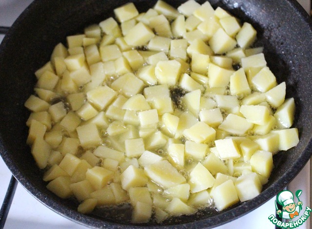 Картофель почистить и нарезать кубиками размером в 1 см.