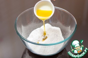 Просеять муку, добавить соль, влить оливковое масло и перемешать