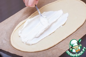 Тесто раскатать как можно тоньше в овальную лепешку. Традиционно форма этого тарта прямоугольная или овальная. Тесто лучше всего сразу раскатывать на пергаменте, а затем перенести его на противень. Загнуть бортики вовнутрь и придавить зубчиками вилки, этот прием не позволит начинке "убежать"