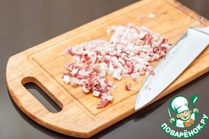 Мелко нарезать бекон или копченую грудинку