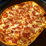 Распределить на сыр жареный лук и затем сверху бекон. Поперчить. Солить не надо, поскольку бекон довольно соленый.