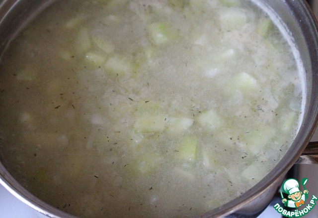 • В бульон добавить спассерованный лук, нарезанные кубиками огурцы, уксус и сушеный укроп, довести до кипения. Сделать меньше огонь и добавить манную крупу, тщательно перемешать, чтобы не было комочков. Варить в течение 20-25 минут, в конце посолить и поперчить.