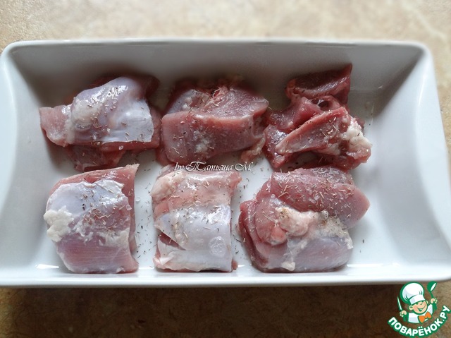 • Индейку порезать на порционные куски, выложить в жаропрочную форму;
